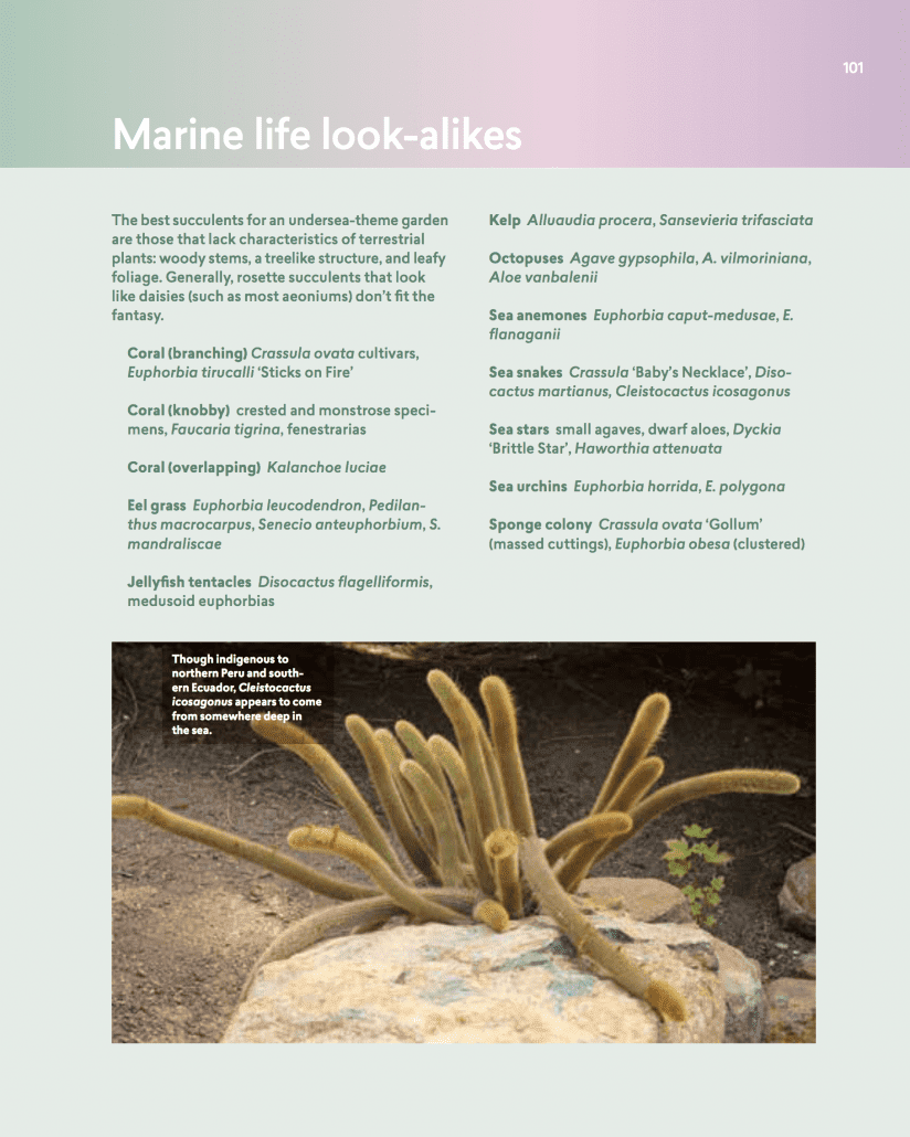 Page 99 — I am glad to see you mentioned aeoniums in the caption. Lots of succulents do well in sea-side conditions, but some such as aeoniums and dudleyas seem MADE for this – you should mention dudleyas, too!